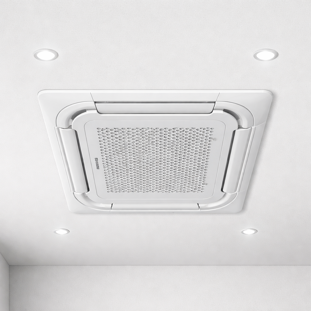 Главная особенность Hisense AVBC-38HJFKA — это кассетный тип монтажа в подвесной потолок. Встраиваемый блок полностью скрывается в потолочной конструкции, а на виду остаётся только декоративная панель формата 600×600 мм, которая гармонично вписывается в потолки типа «Армстронг». Это позволяет сохранить эстетичный внешний вид помещения без лишних элементов.